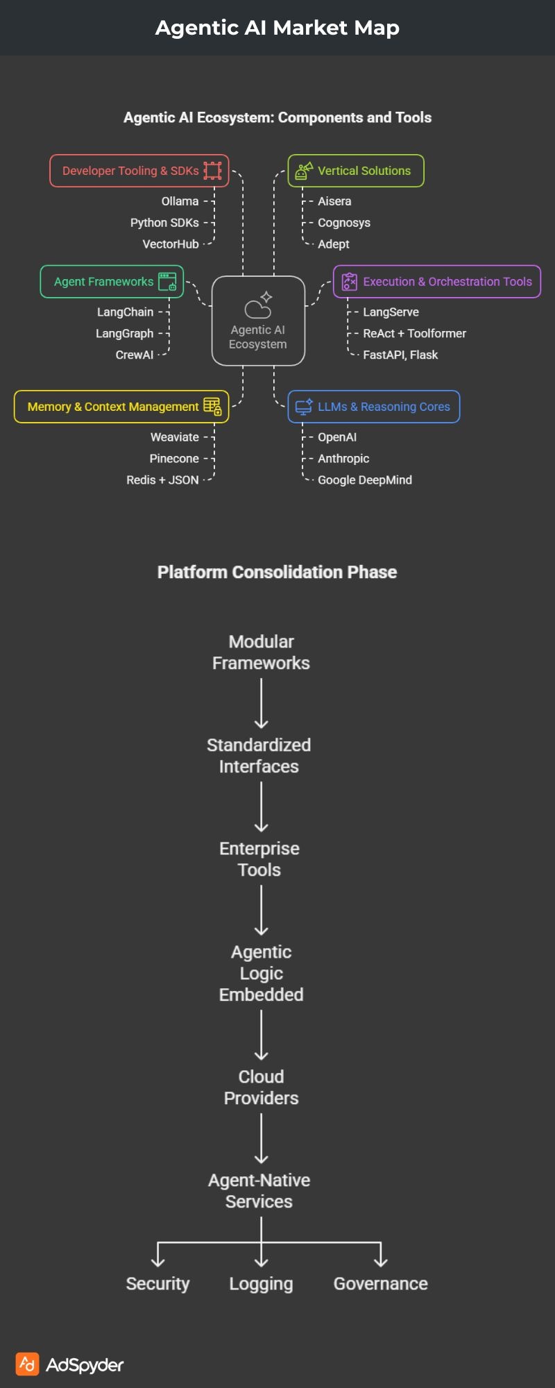 As the AI landscape matures beyond language models and into full-fledged autonomous systems, Agentic AI has emerged as a distinct and fast-growing category. Unlike generative tools that stop at output, agentic systems perceive, plan, act, and reflect—handling full tasks across domains like IT, marketing, customer service, and development. But with so many new frameworks and startups entering the space, it can be difficult to understand who’s doing what, and how the ecosystem is evolving. In this blog, we’ll break down the current Agentic AI Market Map, key tools, platforms, and emerging standards defining this new frontier.