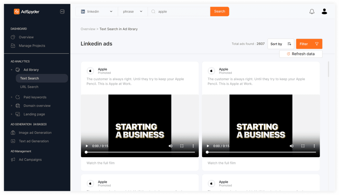 Moreover, AdSpyder enhances your LinkedIn advertising management capabilities with features that support targeted approaches like LinkedIn retargeting, ensuring that your ads reach and engage the most relevant audiences. Whether you’re managing LinkedIn paid advertising for a small business or a large enterprise, AdSpyder equips you with the tools you need to succeed.