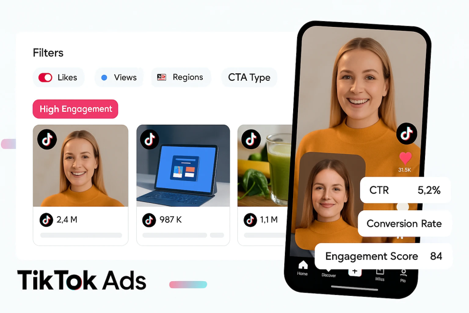 - Comprehensive TikTok Ads Library: Browse thousands of ads across industries, formats, and regions; compare by objective (traffic, app installs, leads, sales).