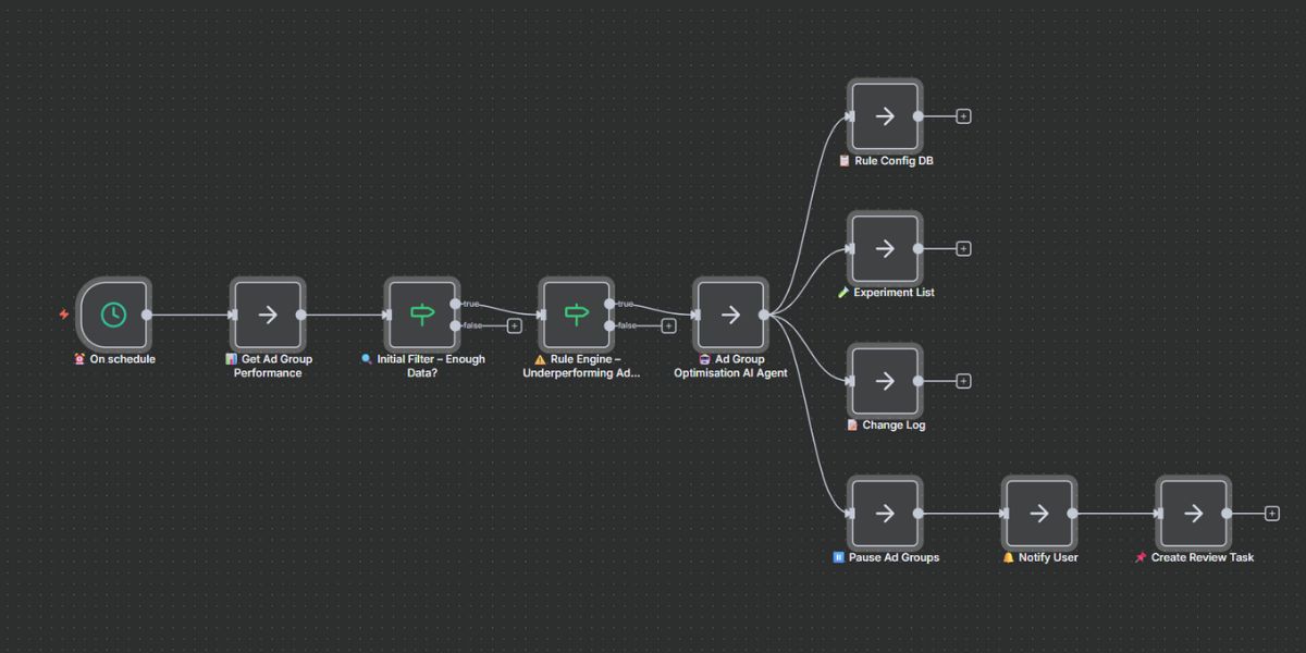 The Ad Group Optimisation Agent continuously evaluates ad groups, flags those that miss your targets, and can pause them automatically based on your rules.