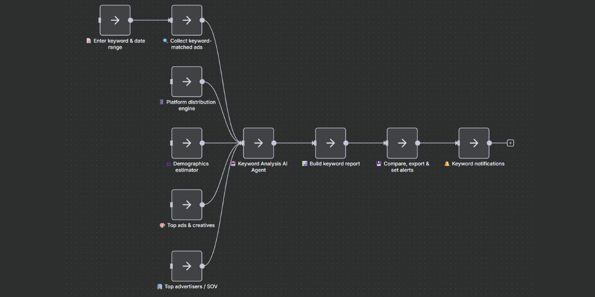 We cluster ads by semantic proximity to the keyword, normalize by platform availability, and flag anomalies (spikes, new geos). All data is derived from publicly observable ad signals.